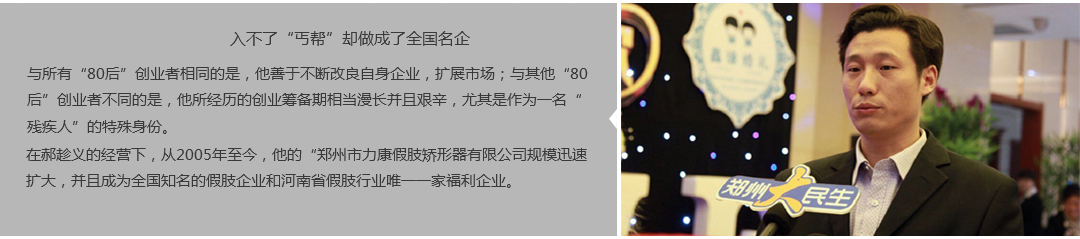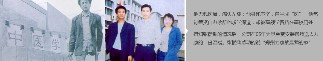 鄭州市力康假肢矯形器有限公司(簡稱力康),是一家專業從事假肢矯形器的設計、研發、制作及裝 配的專業機構。成立于1992年是河南省唯一一家福利企業。力康下設業務部、技術部、住院部、康復 部、售后服務部,并配有現代化的裝配車間和功能齊全的訓練大廳,為殘疾朋友康復訓練提供了可靠 保障。總經理穿戴假肢多年,有著豐富的臨床經驗和親身體會;多年來,力康已為全國幾十萬名殘疾 朋友安裝上舒適、美觀、耐用的假肢和矯形器具,使他們更大限度地恢復了正常的工作和生活?!爱a 品即人品”的質量理念、先進的技術、實惠的價格、完善的售后服務是力康取勝的法寶……